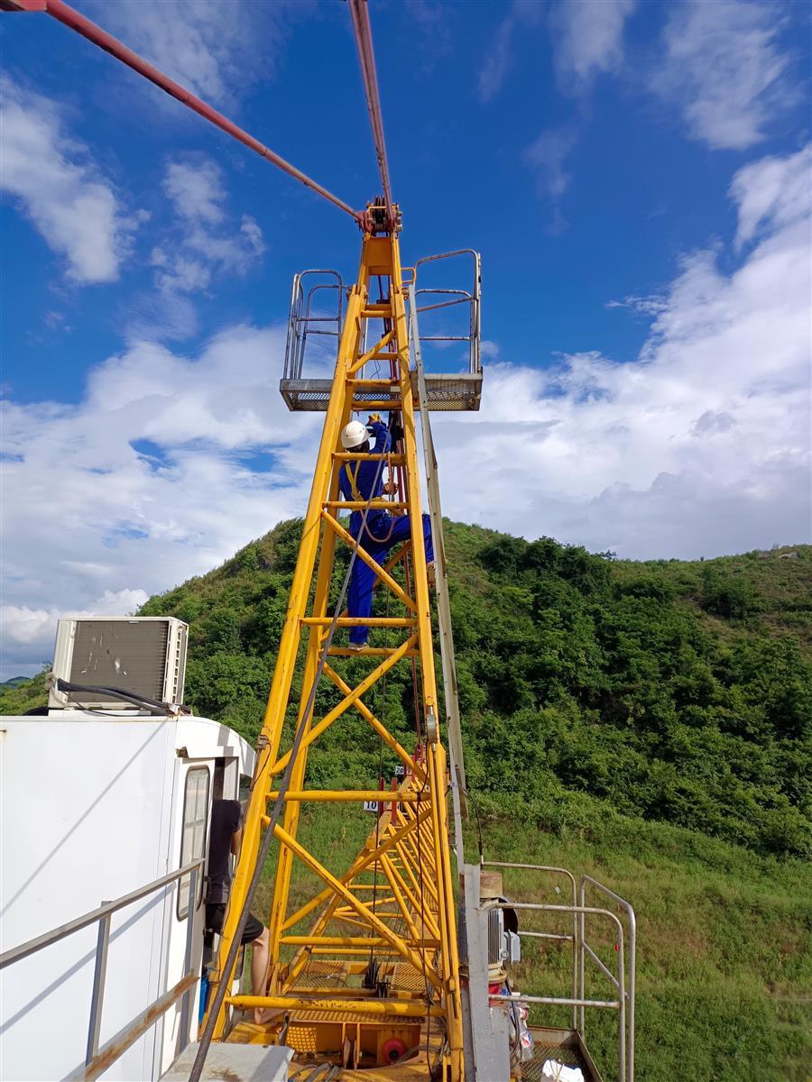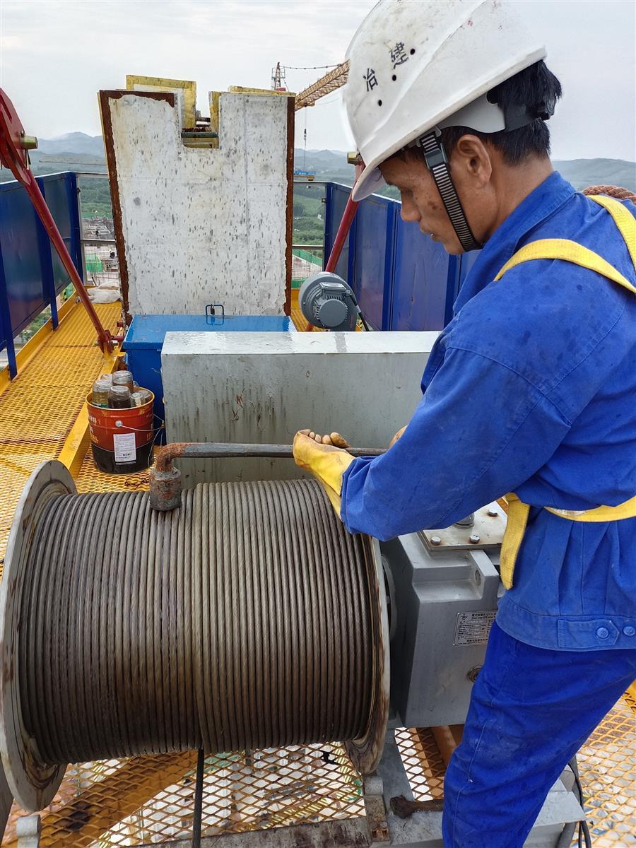 譚建平正在進行塔吊維護保養(yǎng)作業(yè)