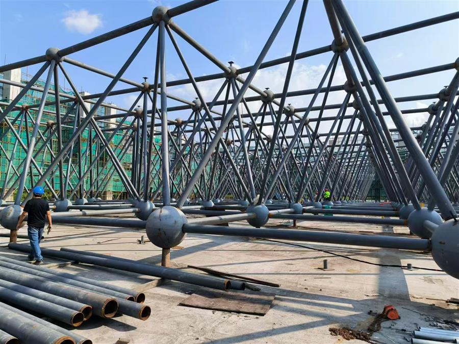 項目正在進(jìn)行鋼網(wǎng)架電焊、焊口除銹、焊口探傷檢測、鋼球補(bǔ)漆等鋼結(jié)構(gòu)施工。為確保項目順利推進(jìn),項目部倒排工期計劃并及時根據(jù)現(xiàn)場情況更新安排,配足人力機(jī)械,加班加點,齊心協(xié)力,全員投入推進(jìn)項目建設(shè)。目前,已完成拼裝任務(wù)的50%。