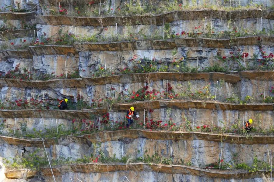 “我們已經(jīng)在山上種下了25萬(wàn)多株各類(lèi)苗木。”工程項(xiàng)目經(jīng)理陳超宇說(shuō),工人們需要先清理有滾落危險(xiǎn)的巖石,然后用鋼筋和混凝土在峭壁上搭建V型板槽,再給開(kāi)辟出來(lái)的“梯田”回填泥土,并在“田間”鋪設(shè)噴淋系統(tǒng),最后才能進(jìn)行種植。目前種植的苗木有石山紫薇、夾竹桃、石山榕、爬山虎、三角梅、杜鵑等。