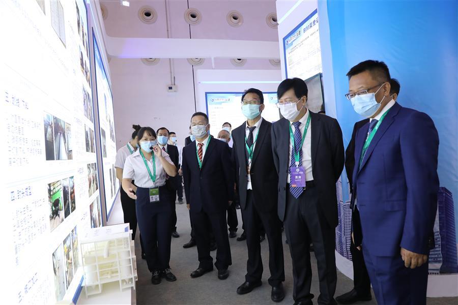 自治區(qū)住房和城鄉(xiāng)建設(shè)廳副廳長葉云(左二)、潘國雄(左三)一行到冶建公司展區(qū)參觀