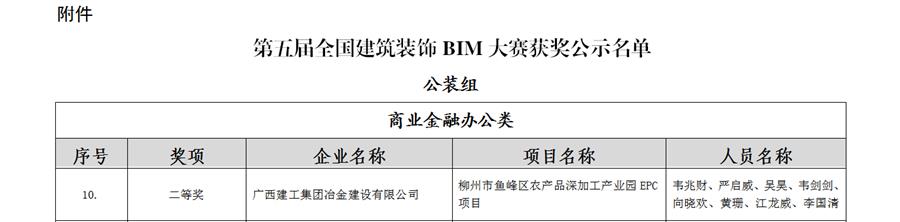 近日,冶建公司基礎分公司技術成果——柳州市魚峰區(qū)農(nóng)產(chǎn)品深加工產(chǎn)業(yè)園“基于BIM技術在施工過程中的精細化管理”,獲得2項國家級獎。該技術成果分別在中國建筑業(yè)協(xié)會主辦的第八屆建設工程BIM大賽中獲得三類成果獎和中國建筑裝飾協(xié)會工業(yè)和信息化分會主辦的第五屆全國建筑裝飾BIM大賽中獲得公裝組二等獎。