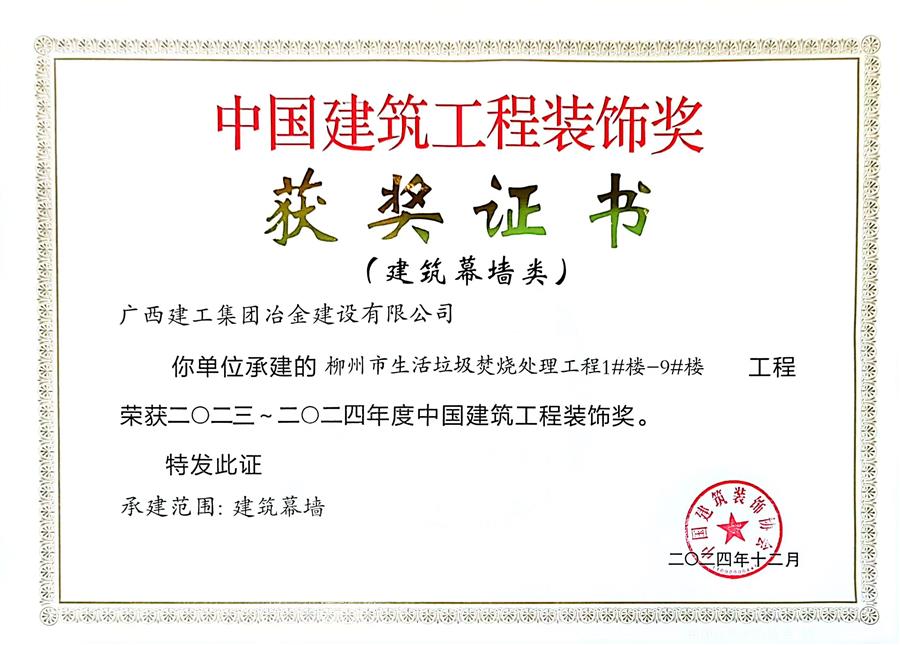 12月10日,中國建筑裝飾協(xié)會九屆四次理事會九屆六次常務理事會暨中國建筑裝飾協(xié)會成立40周年大會在北京召開,冶建公司承建的柳州市生活垃圾焚燒處理工程1#樓-9#樓獲2023—2024年度“中國建筑工程裝飾獎”。至此,冶建公司已經七奪“中國建筑工程裝飾獎”。
