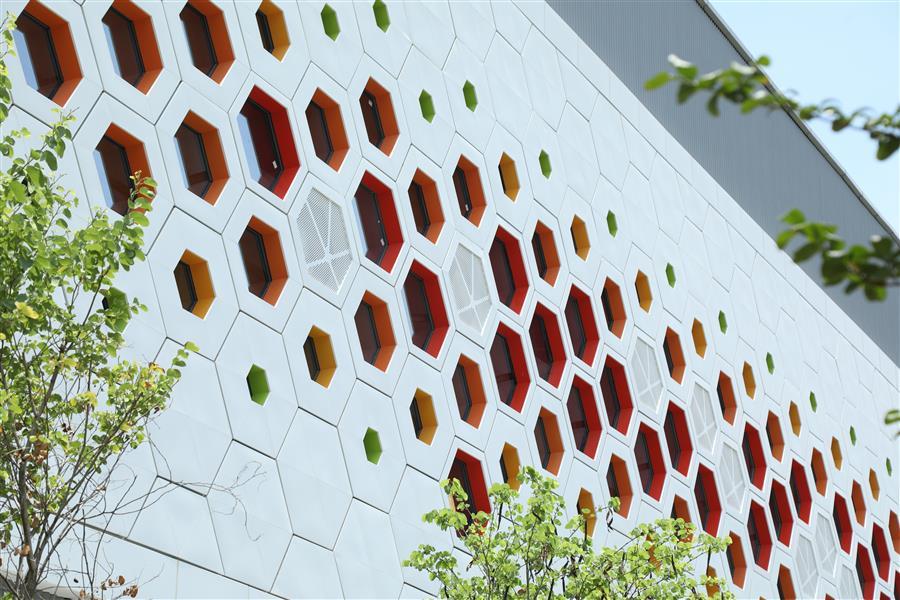 項目建筑外立面設計將柳州本土文化元素“紫荊花”與康恒公司“蜂巢”理念完美融合,多層次的幕墻肌理協(xié)同自然光線,在不同照射條件下呈現出多樣的光影效果,不僅呼應了垃圾焚燒發(fā)電精細的工藝流程,更體現了人與自然和諧共生的美好愿景。