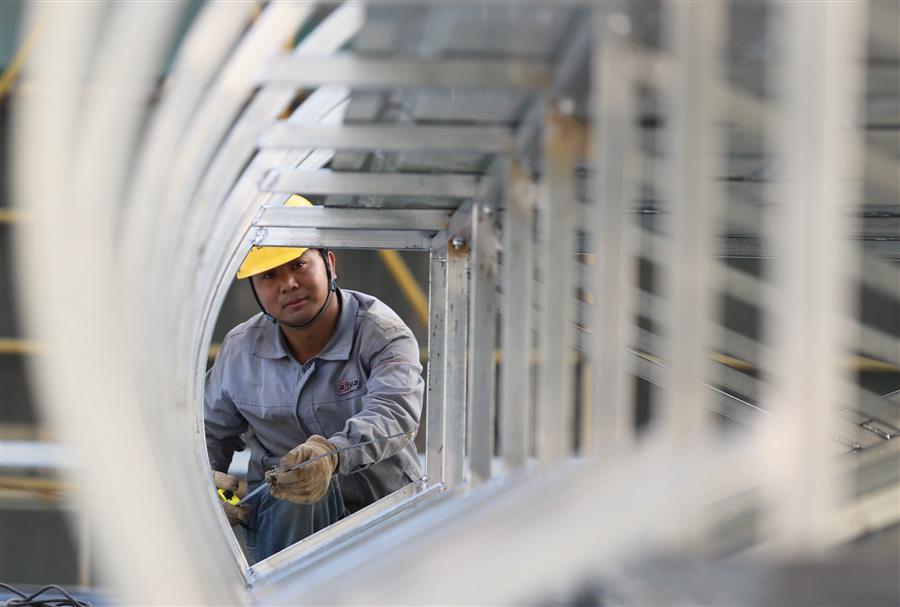 11月5日,工人在測(cè)量鋼構(gòu)架,準(zhǔn)備安裝墻板。