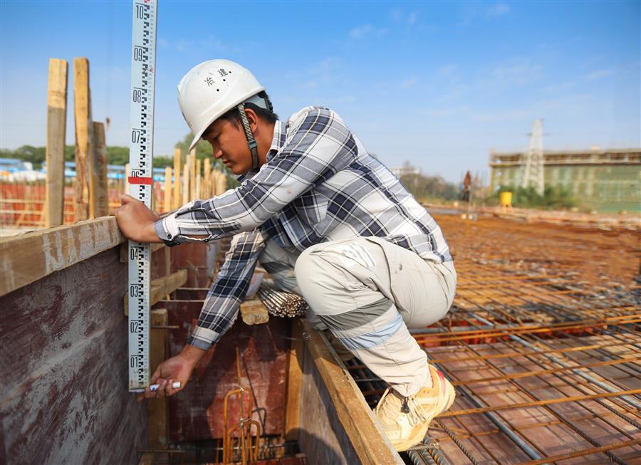 11月5日,工作人員在檢查已扎好的鋼筋網(wǎng)情況。