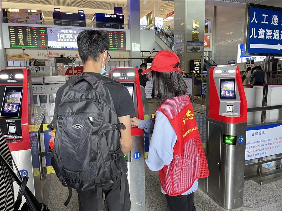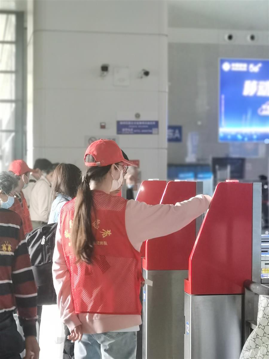 冶建志愿者們在火車站協(xié)助車站工作人員做好疫情防控工作,在進(jìn)站口給乘客測體溫,核實(shí)健康碼、行程碼、核酸證明,引導(dǎo)乘客刷身份證進(jìn)站、為進(jìn)出站的乘客指路。