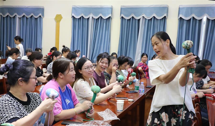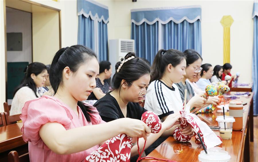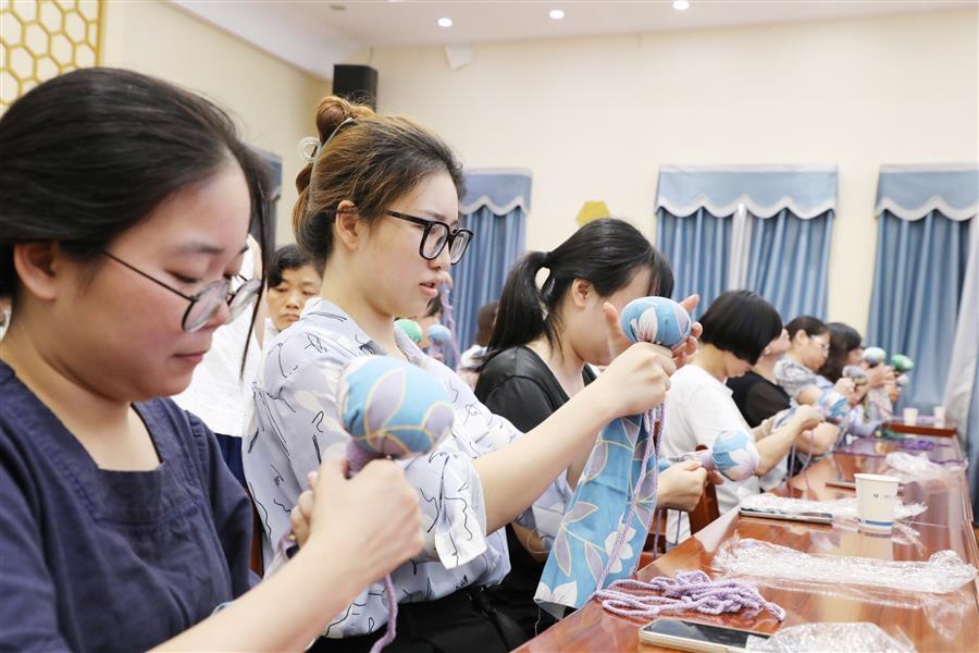 課堂上,培訓(xùn)老師王春梅為大家詳細(xì)講解了艾草養(yǎng)生錘的功效和用途,并演示了其制作方法和步驟。“將錘柄插入艾草包,拉緊艾草包,然后將其放在布料三分之一處,捏成一個(gè)緊實(shí)的圓球……”在王老師的指導(dǎo)下,女職工們積極參與,跟著老師的指導(dǎo)一步一步地制作自己的養(yǎng)生艾草錘。大家認(rèn)真細(xì)致的聽講并按步驟制作,不久一把把色彩鮮艷、質(zhì)量上乘的艾草養(yǎng)生錘相繼“出爐”。大家互相試用,現(xiàn)場(chǎng)洋溢著歡聲笑語(yǔ)。